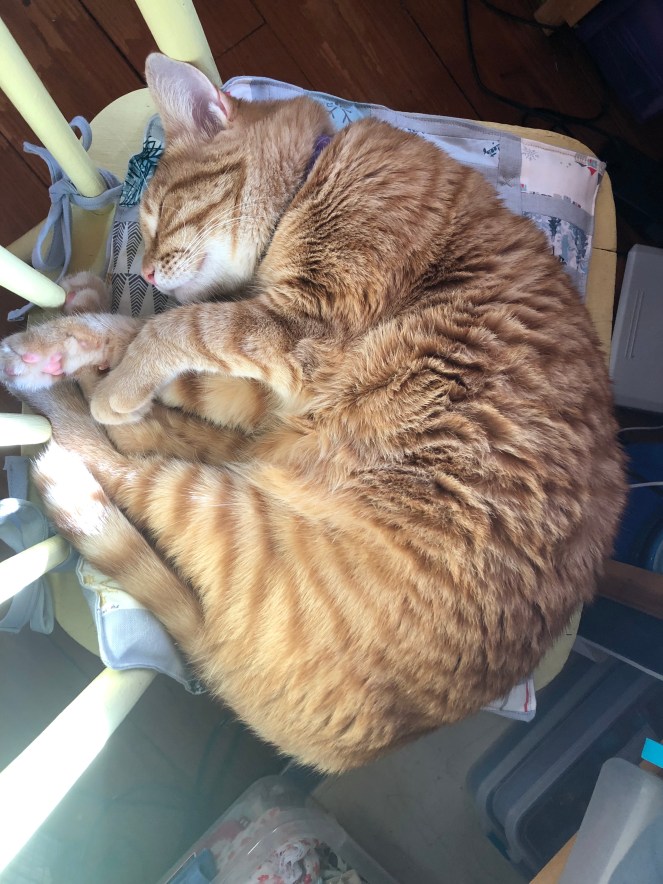 Hello there! I’m excited to share today about a project that is not a garment. I decided to make a pillow for my sewing chair and use wool batting for the cushion. As I predicted, as soon as I finished this project, one of my cats has claimed it.