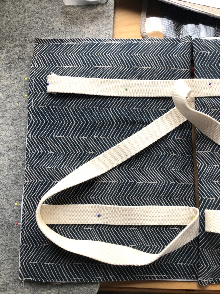 For the straps I used cotton webbing. I pre-washed the cotton webbing along with the fabric. I found that it shrank 1″ after washing and drying. This resulted in a final length that was shorter then the suggested 2.5 yards. I felt the slight length difference was not a problem.