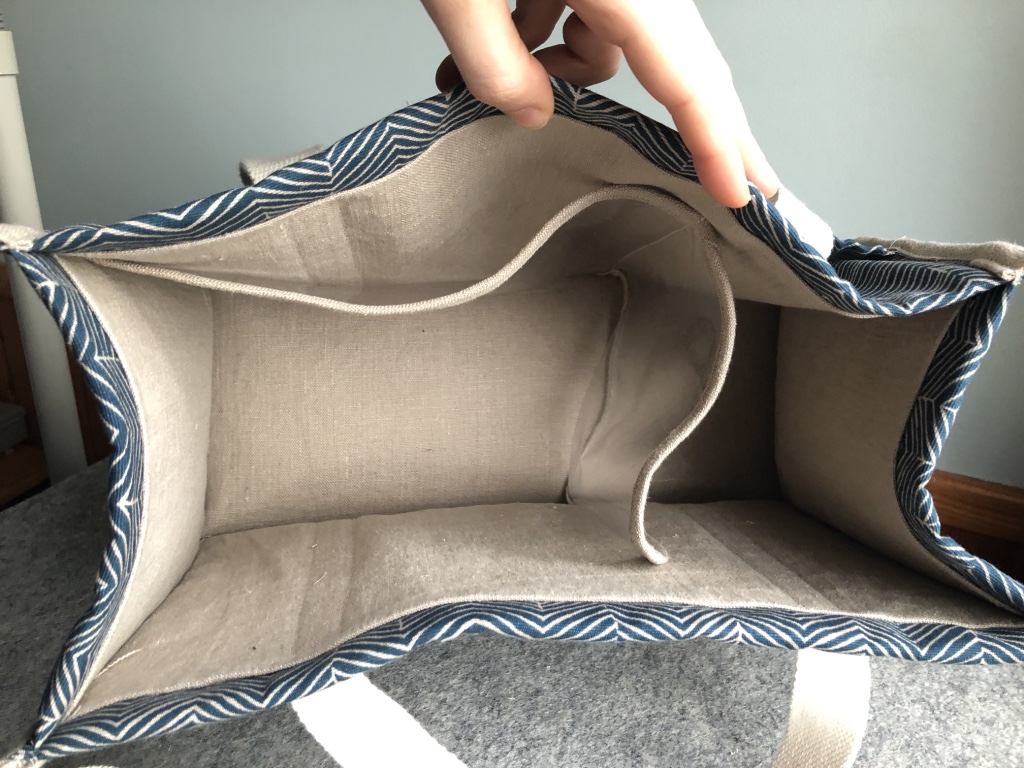 Fabric used (did you use the suggested fabrics in the pattern)? Both fabrics that I selected were purchased from IKEA. For the outer fabric I used a lightweight canvas fabric. The lining fabric is a matching linen. For the bias tape, I made some from the linen fabric (referencing Sew Sew Live’s suggested video for a very quick way to make bias tape).