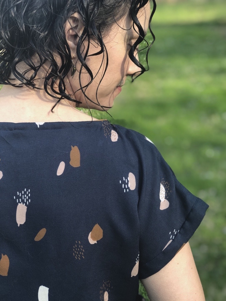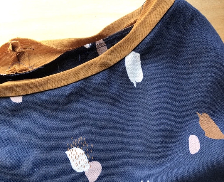 This viscose fabric by Atelier Brunette (in the Moonstone print) is very lovely. The bits of ochre in the print are my favorite. I picked a coordinating bias tape to finish the neckline.