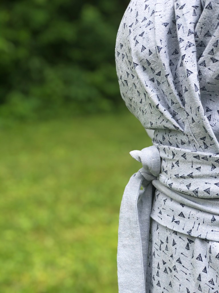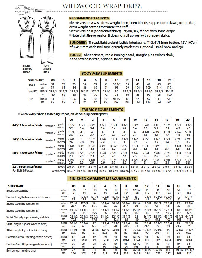 Pattern Description – There are so many things to love about the Wildwood Wrap Dress. It is perfect for the office, weddings, parties or when you just feel like wearing a dress. It is a true wrap dress however, the obi-inspired belt is detached. While it was originally designed with linen and crisp cotton fabrics in mind, the short sleeve version A is beautiful in rayons, silks and drapier fabrics as well. The dolman sleeve version B requires a more stable fabric to keep the rolled sleeves in place. Choose a below the knee hem (hem version A) or a midi-length hem (hem version B). This dress is deceptively easy. It has been rated intermediate due to the hem facings and the French seams on the shawl collar however, a confident or determined beginner could tackle this.