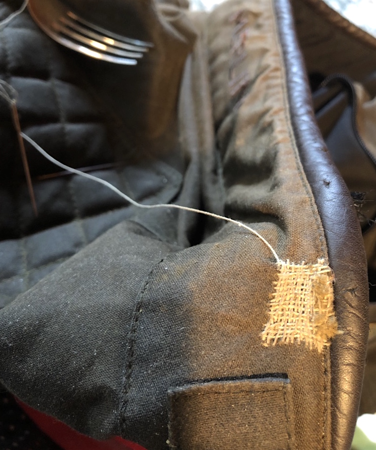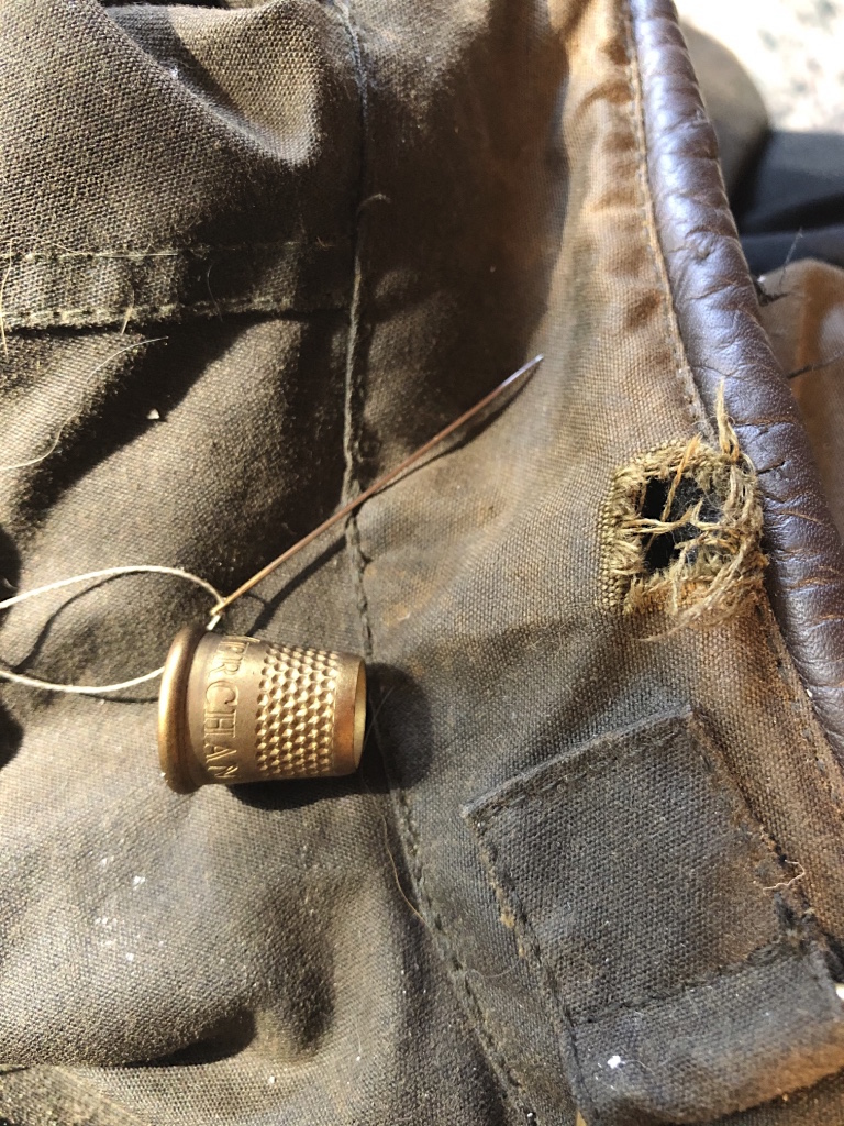 I used some DMC cotton thread along with beeswax and a Merchant & Mills Tailor’s thimble for the first mend. I added beeswax to the embroidery thread before stitching. I decided with the jacket material being a waxed canvas, it would be nice to include wax with the mending thread to match the materials.