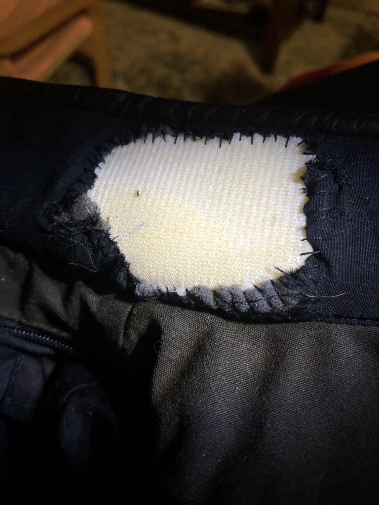 For the next jacket mend, foam had been removed in the collar (by our dog). I used Annie’s Foam Stabilizer to fill the gap and a square of rayon fabric to patch outside of the hole (the outer rayon patch isn’t pictured).