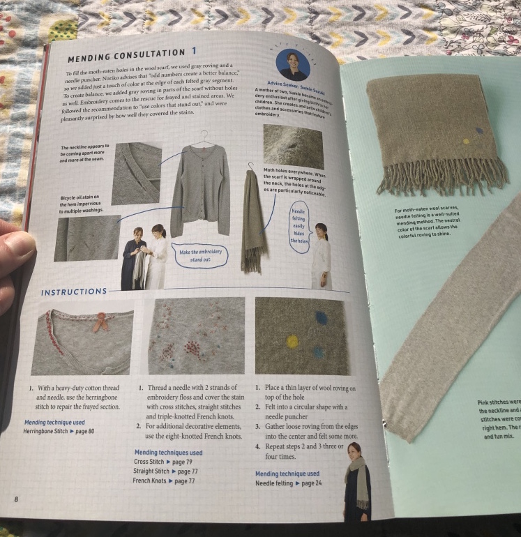 In this section, Noriko recommends creating your own mending repair kit to keep all of your supplies together. I have enjoyed doing this as well! It makes the process of mending much quicker when you keep all of your supplies together.