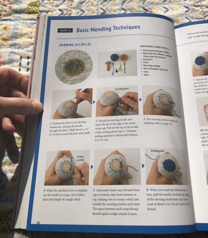 I love that this book walks through specific mending applications with a variety of uses and includes detailed instructions. It’s REALLY helpful to read and then apply to your own mending. Every finished photo included in the book includes references to the directions for how to recreate each aspect of the mend.