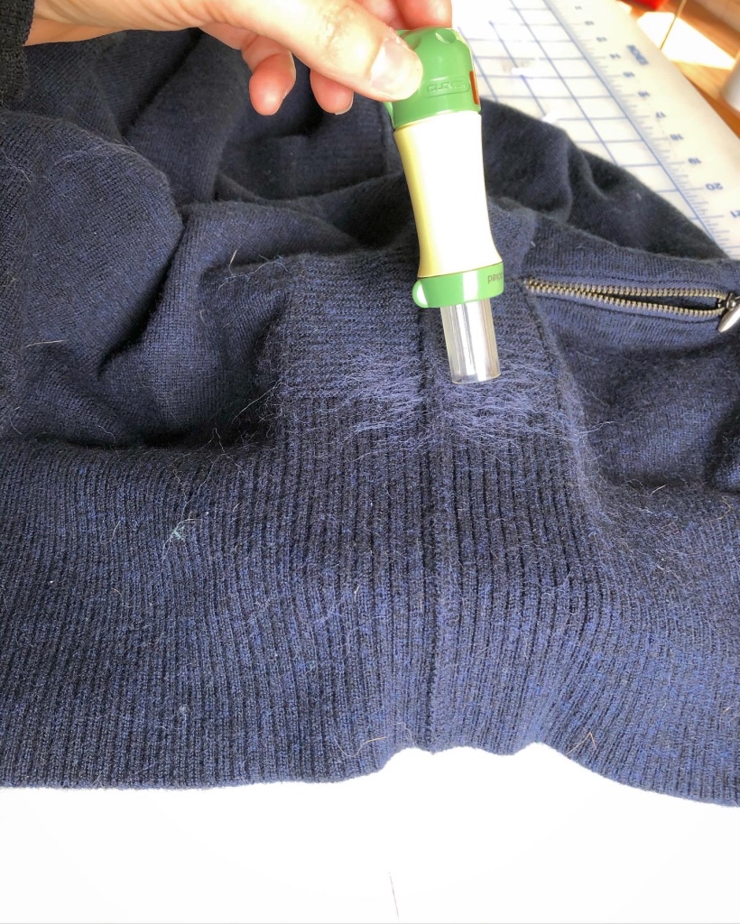 I LOVED the mending approach mentioned in the book to needle felt holes in wool clothing. I hadn’t tried this approach yet and was excited to give it a try for an invisible approach. I used a Clover needle felting mat and Felting needles for this mending (along with matching navy wool roving).