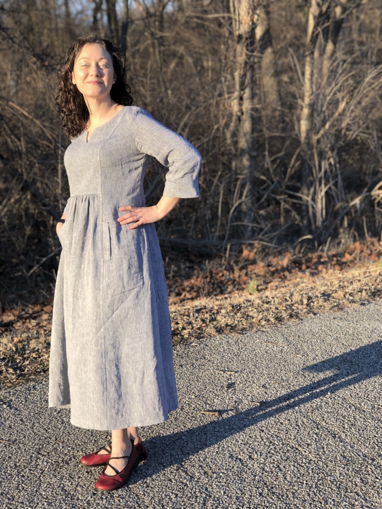 I’m excited to share with you today about making the Cinema Dress by Liesl and Co with some gorgeous linen fabric from Minerva. The fabric is lightweight and super comfortable to wear. The texture in the weave has some really neat slubs of thread for a handwoven look.
