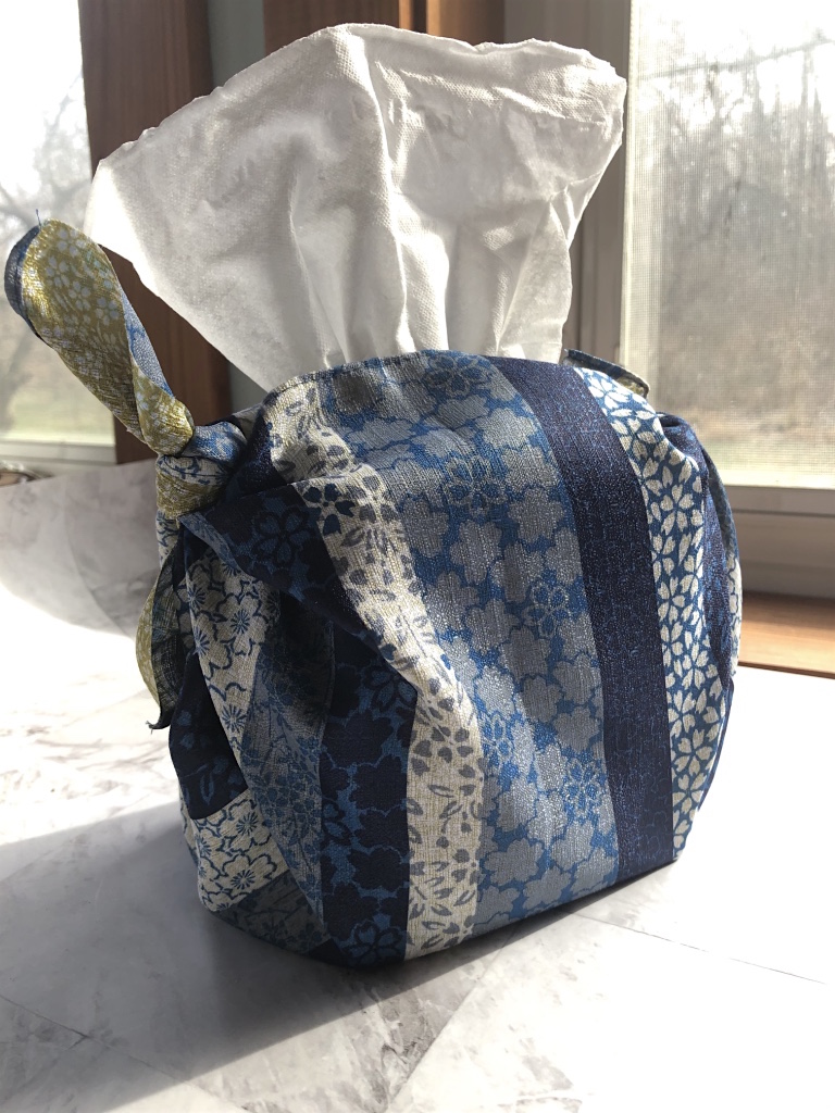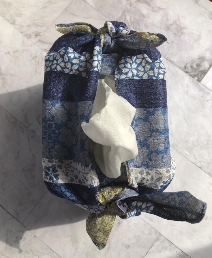 In the book example, a rectangular tissue box was covered. I followed the same instructions but instead covered a square tissue box that we had on hand. I loved this idea so much that I left this Furoshiki cloth on the tissue box have this now in our bedroom. This polyester cloth was more slippery to work with but I’m glad I tried it to compare. I like the strips of prints on this one and that it’s a reversible fabric as well.