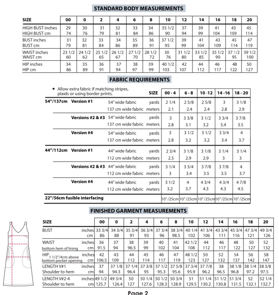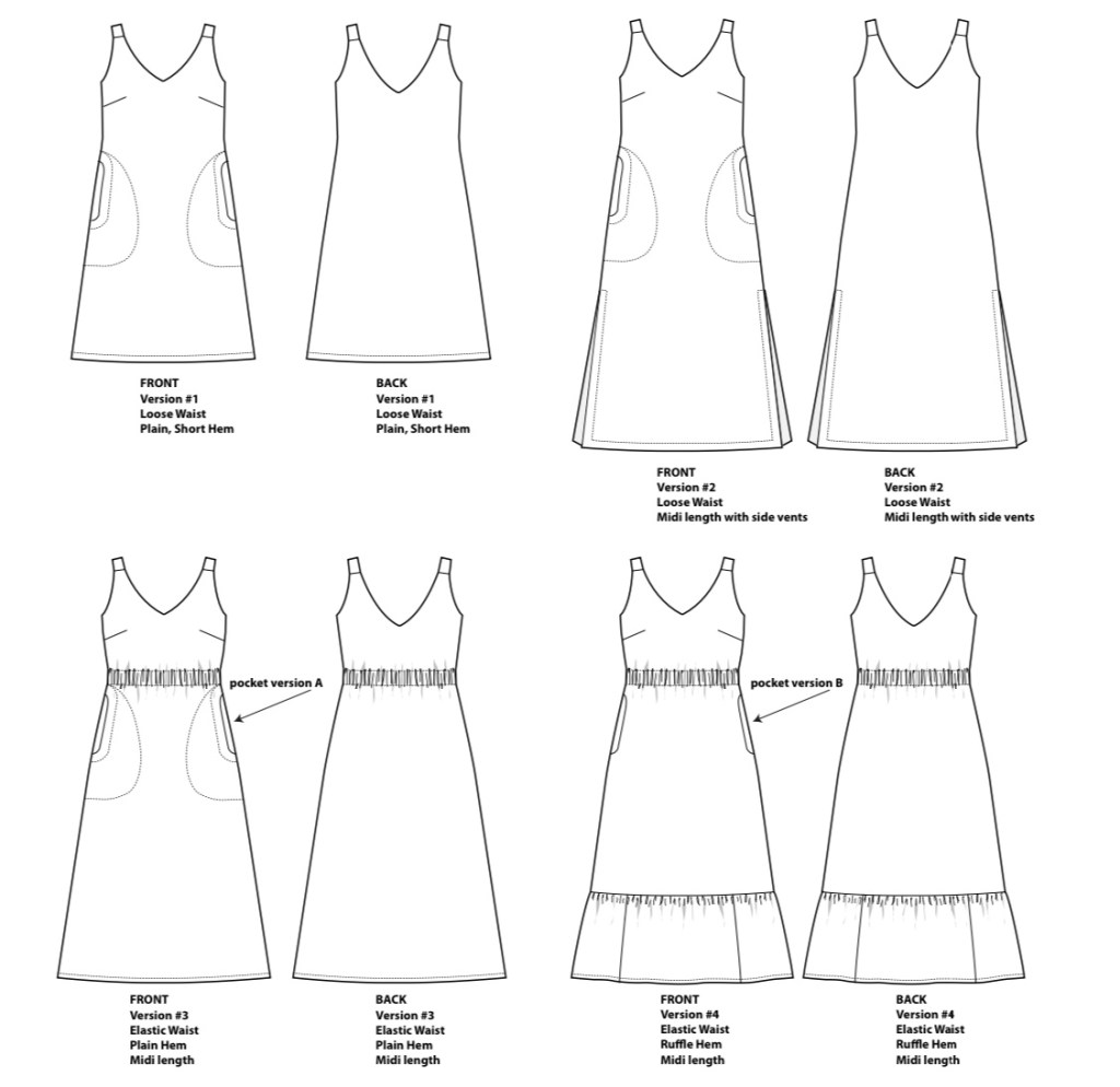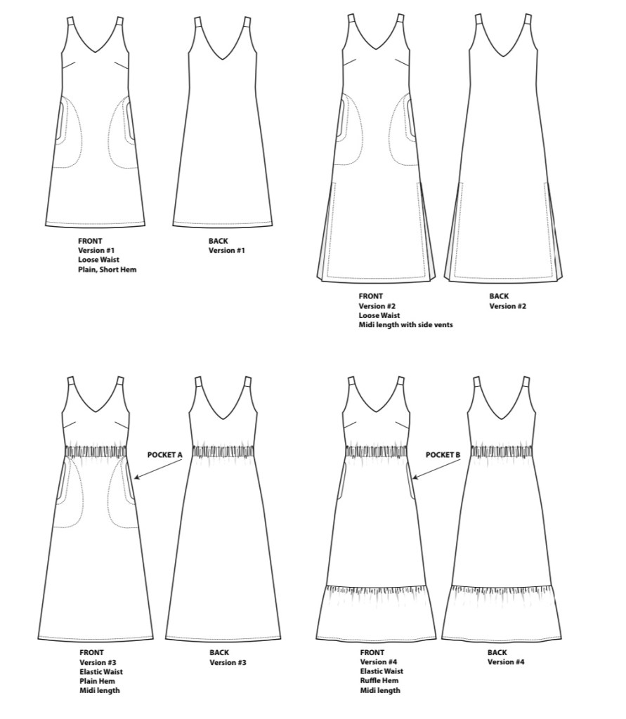 Features: – Front & Back V-necklines – the back neck is low but should just cover a bra. – Shoulder straps that cover bra straps with optional bra keeper snaps. – Bust darts – Pockets: Version A = topstitched, single layer pockets; Version B = in-seam, loose pockets.